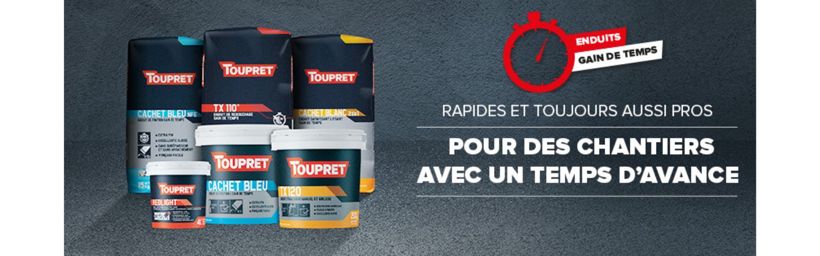 Avec notre gamme d'enduits TOUPRET gain de temps, vous avez la possibilité de réduire le temps nécessaire pour les différentes étapes de rebouchage, d'égalisage et de lissage avant la mise en peinture.