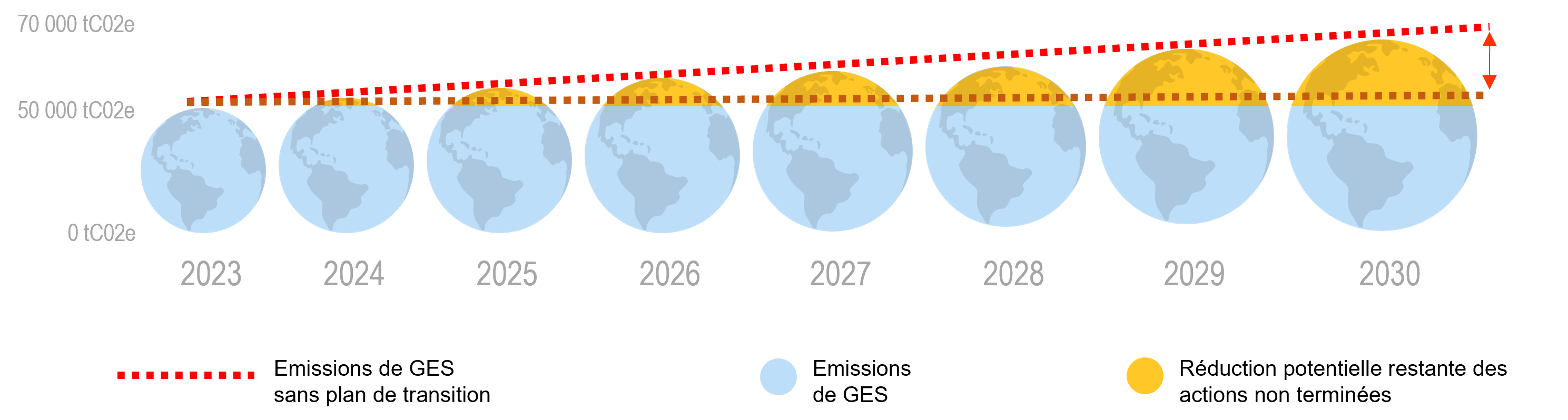 A travers notre plan d’action nous nous fixons l’objectif de diminuer de 16,5% nos émissions de GES à horizon 2030 par rapport aux émissions prévues sans plan d’actions.